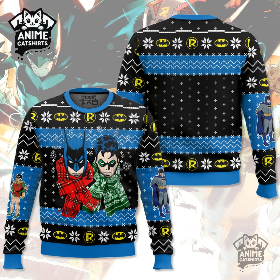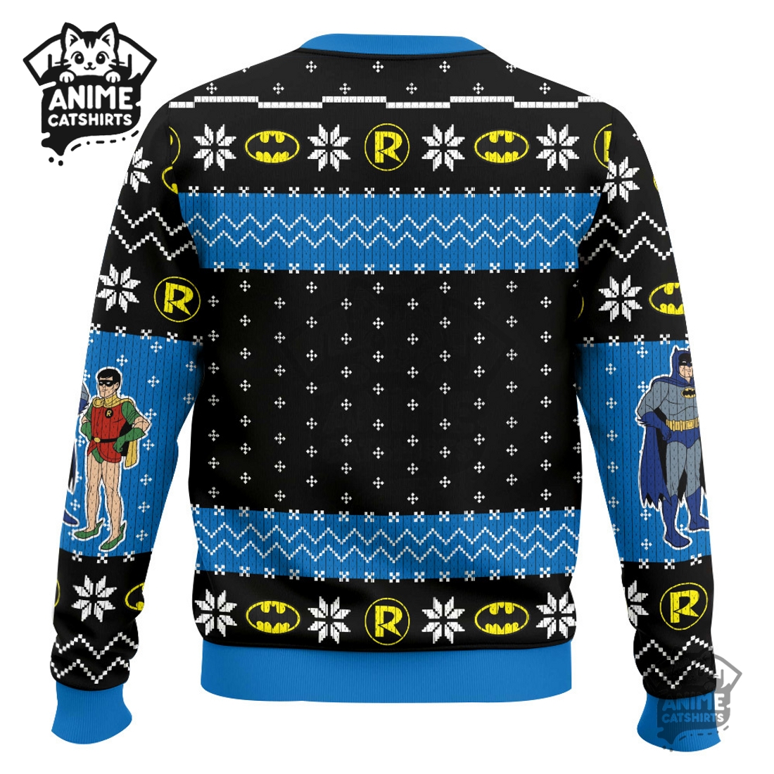 The Batman And Robin Ugly Christmas Sweater presents a uniquely festive garment, blending iconic superhero fandom with classic holiday kitsch to create an unforgettable statement piece. Its meticulously crafted design prominently features the legendary Dynamic Duo, reimagined through an intentionally busy, yet cohesive, knit pattern characteristic of “ugly” sweaters. Imagine a backdrop of a snow-dusted Gotham skyline, subtly woven in, against which oversized snowflakes and twinkling starbursts evoke a chilly festive night. Bold, slightly pixelated renditions of Batman’s distinctive cowl and Robin’s iconic ‘R’ emblem are strategically placed, not as simple prints, but as integral parts of the fabric, meticulously knitted with various colored threads. This creates a rich, tactile experience inherent to authentic sweater construction. Further enhancing the holiday cheer, playful strands of vibrant Christmas lights, festive holly berries, and even oversized candy canes appear to playfully intertwine with the heroes. The chosen color palette masterfully marries Batman’s traditional dark aesthetic—deep blacks, charcoal grays, and muted blues—with Robin’s vibrant reds and greens, all underscored by traditional holiday hues of red, green, and crisp white. This clever juxtaposition makes the sweater truly unique: it’s simultaneously dark and light, serious and silly, instantly recognizable and delightfully irreverent, appealing perfectly to both superhero aficionados and festive party-goers.