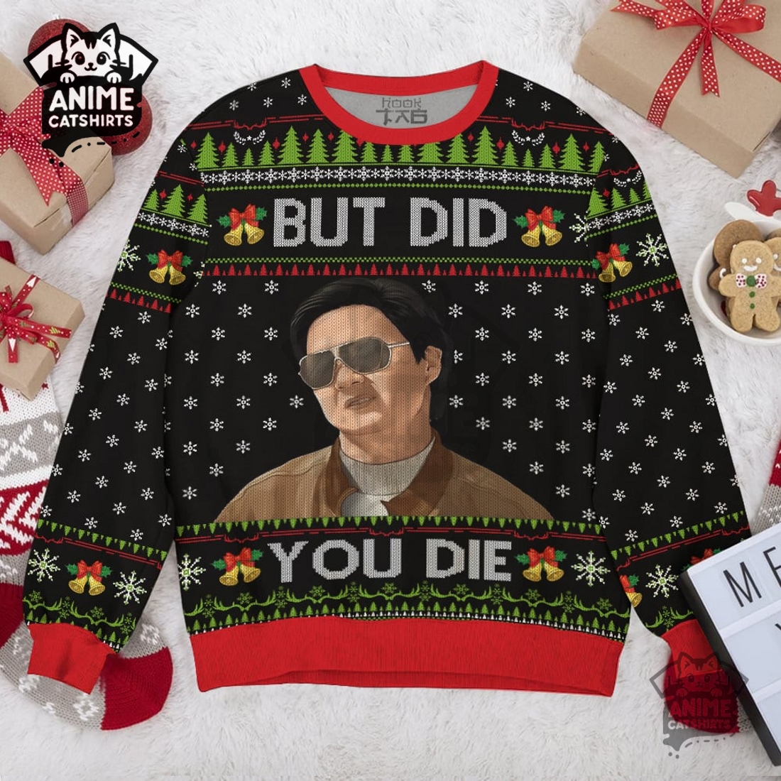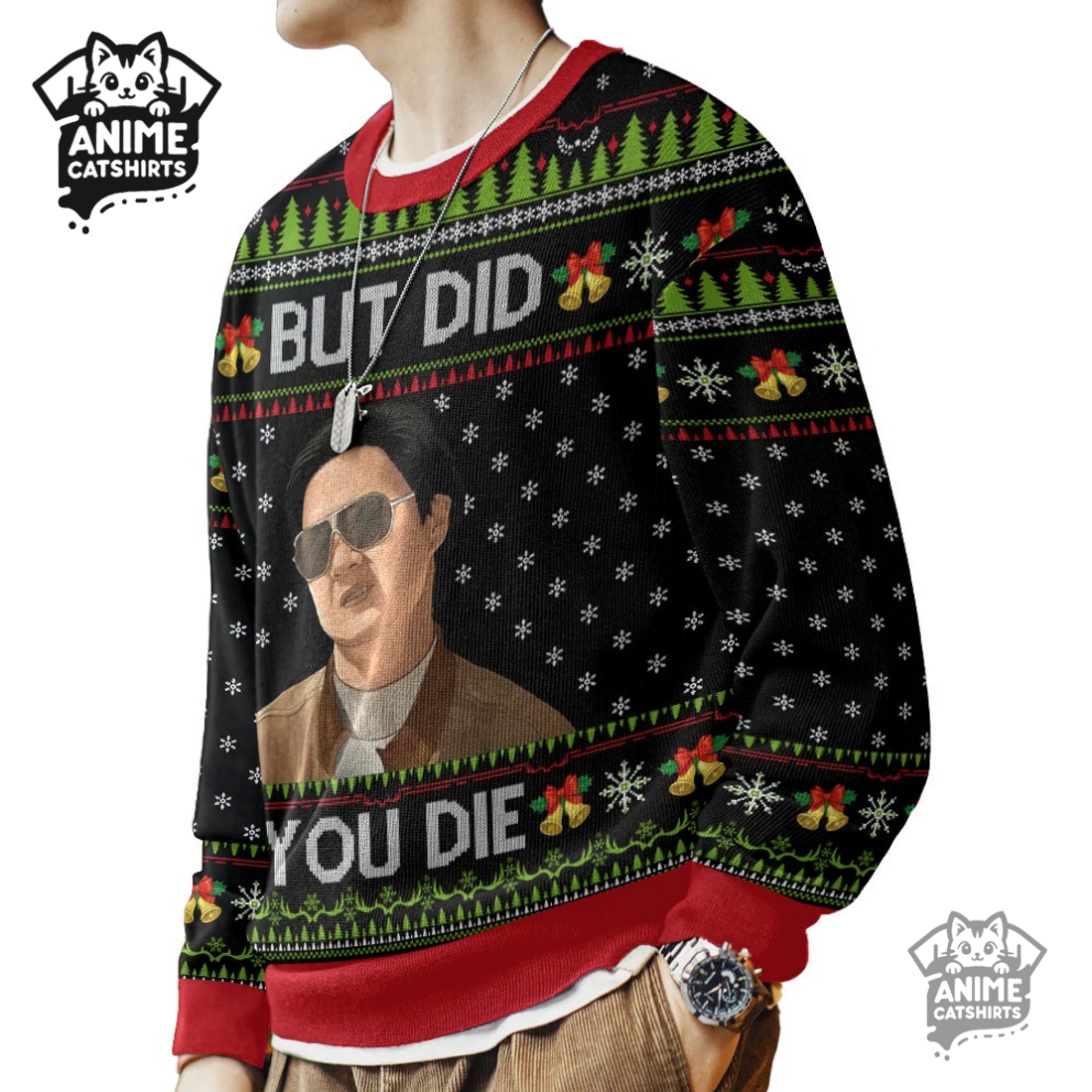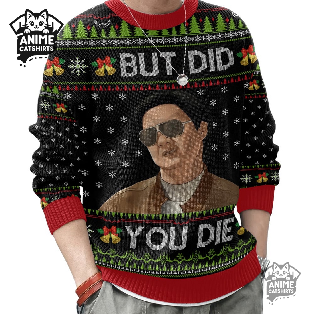 This distinctive garment presents a perfect blend of holiday cheer and iconic movie humor, catering to those who appreciate a unique, unforgettable statement piece for their seasonal wardrobe. Its primary appeal lies in its unmistakable design, centering around the legendary “But Did You Die Mr. Chow” quote from – The Hangover- franchise. The bold typography of this phrase immediately catches the eye, often rendered in a vibrant, attention-grabbing font that stands out against a backdrop skillfully woven with traditional “ugly Christmas sweater” motifs. Imagine the infamous Mr. Chow himself, perhaps rendered in a caricatured, festive style, integrated seamlessly with classic holiday elements like snowflakes, candy canes, reindeer, or even miniature Christmas trees, all given a chaotic, party-gone-wrong twist that perfectly encapsulates the movie’s spirit. The color palette typically leans into the garish yet appealing aesthetic of an ugly sweater, featuring clashing reds, greens, blues, and yellows that, paradoxically, work together to create a cohesive and highly visible design. The print quality is paramount, ensuring the intricate details of Mr. Chow’s maniacal grin or the subtle movie easter eggs remain crisp, vibrant, and resistant to fading, even after multiple washes, making it a durable item for many holiday seasons to come.