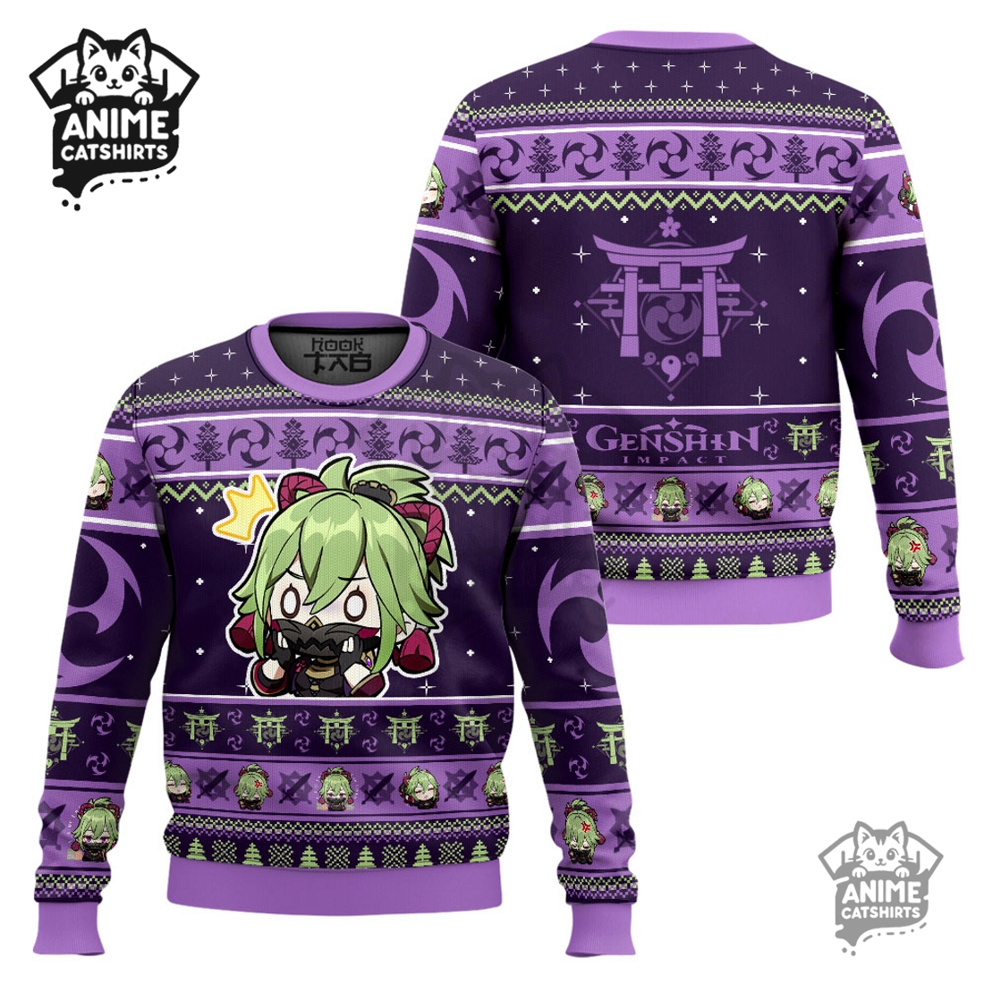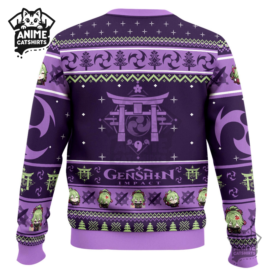 This Genshin Impact Kuki Shinobu Ugly Christmas Sweater offers a uniquely engaging and comfortable garment for fans of Teyvat’s beloved characters and the festive holiday season. Its design masterfully blends traditional “ugly Christmas sweater” motifs with the distinct iconography of Kuki Shinobu, the sharp and reliable deputy of the Arataki Gang. Users will immediately notice Kuki Shinobu herself, depicted in a charming, slightly stylized or chibi art style, possibly donning a miniature Santa hat or holding a festive prop like a candy cane or a small gift box, ensuring she remains recognizable while embracing the holiday spirit. Surrounding her, the sweater is intricately knit with classic holiday elements such as snowflakes, reindeer, Christmas trees, and perhaps string lights, but these are cleverly interspersed with Genshin Impact lore: tiny Electro visions might sparkle amidst the snowflakes, Mora coins could replace traditional ornaments, or even mischievous Hilichurls and Slimes could peek out from behind stylized pine trees. The color palette typically harmonizes vibrant holiday reds and greens with Kuki Shinobu’s signature purple and teal accents, creating a visually dynamic and unmistakably themed piece that stands out in any crowd.