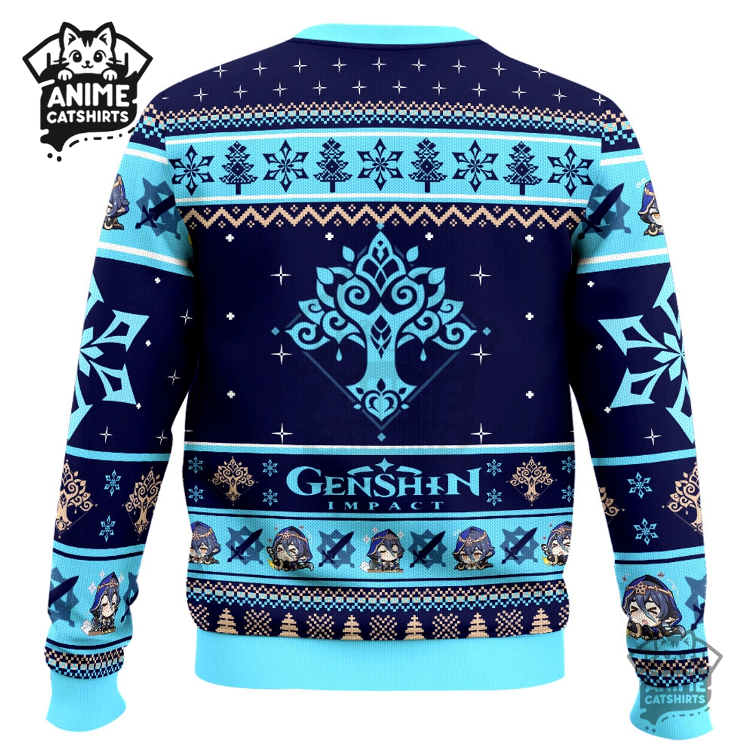 This product truly meets the needs of several potential customer segments. For the dedicated Genshin Impact fan, it offers an unparalleled opportunity to express their passion for Teyvat and its inhabitants in a seasonal context. It’s a statement piece that proudly declares fandom without being overtly childish, suitable for all ages. For those specifically seeking an “ugly Christmas sweater,” it provides a refreshing alternative to generic designs, injecting personality and a niche interest that guarantees uniqueness at any holiday party. Imagine the smiles and recognition from fellow gamers, and the intrigued questions from those unfamiliar with Teyvat, creating instant icebreakers and opportunities to share your love for Genshin Impact. The unisex relaxed fit ensures comfortable wear for all body types, designed to drape comfortably without feeling restrictive. Ribbed cuffs and hem provide a snug, yet flexible fit, preventing cold drafts and maintaining the sweater’s shape over time. It’s also incredibly easy to care for, being machine washable, which is a major advantage during the busy holiday period.