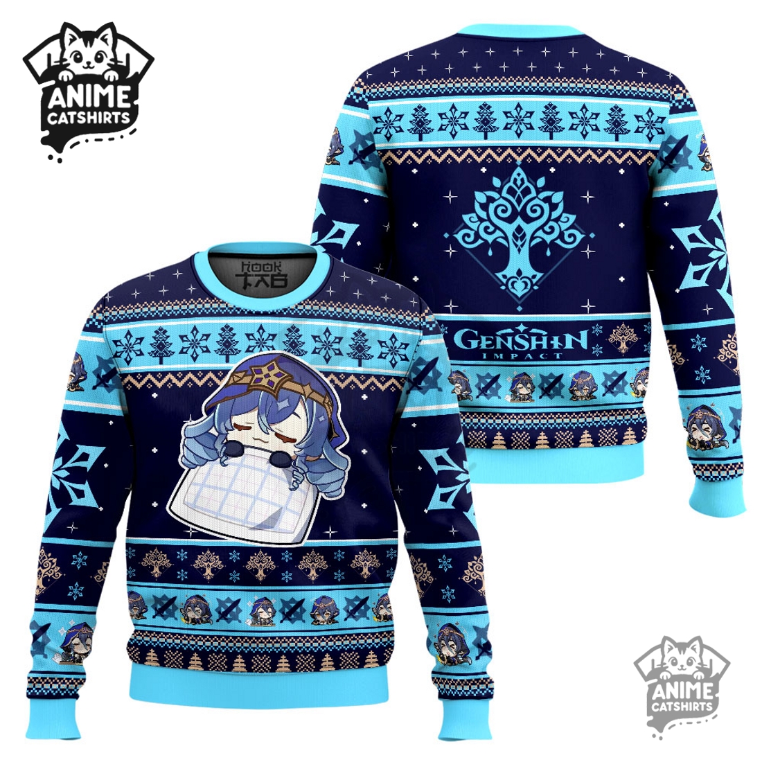 This distinctive Genshin Impact Layla Ugly Christmas Sweater presents a uniquely charming and incredibly comfortable way for fans to celebrate the holiday season, merging beloved gaming lore with festive cheer. The moment you first encounter this garment, its thoughtful design immediately stands out, moving beyond mere merchandise to become a wearable piece of art that truly embodies the spirit of both the game and traditional holiday kitsch. At the heart of its appeal is the meticulous depiction of Layla, Sumeru’s drowsy yet diligent student, re-imagined with a playful, holiday twist. Instead of a straightforward character render, imagine Layla rendered in a stylized, almost chibi-like fashion, perhaps surrounded by swirling icy patterns that evoke her Cryo vision and starry dreams. Her signature dark blue and white color palette is cleverly integrated with classic Christmas reds, greens, and whites, creating a visual tapestry that is both instantly recognizable to Genshin Impact enthusiasts and delightfully festive for anyone.