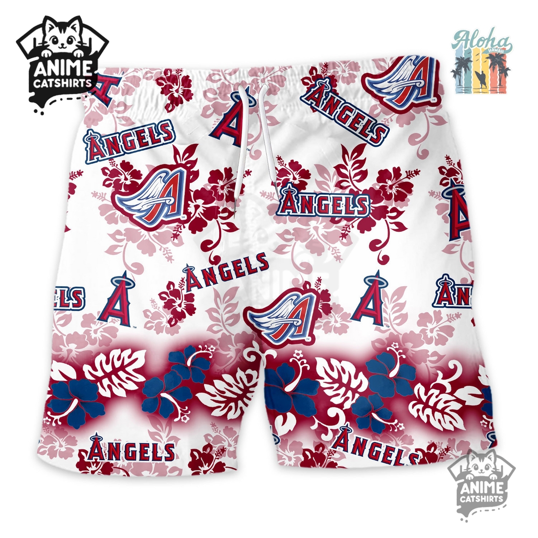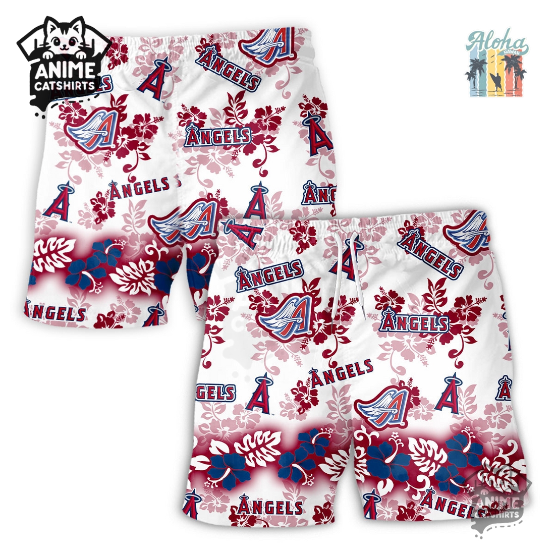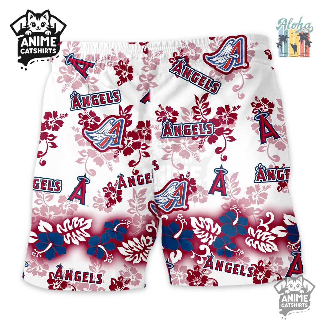 Its most striking feature is the vibrant “Aloha Paradise” print, a sophisticated fusion of classic Hawaiian motifs and Los Angeles Angels iconography. Imagine a lush canvas of deep reds, tropical blues, and crisp whites – the Angels’ signature colors – artfully interwoven with patterns of swaying palm trees, exotic hibiscus flowers, and perhaps subtle baseball-themed elements like hidden mitts or baseball seams incorporated into the foliage. The iconic Angels logo, often in a stylized or slightly distressed finish, is strategically placed throughout the print, making your fandom clear without being overtly aggressive. This artistic integration means the shorts exude a relaxed, vacation-ready vibe that simultaneously broadcasts your loyalty in a tasteful, non-traditional manner.