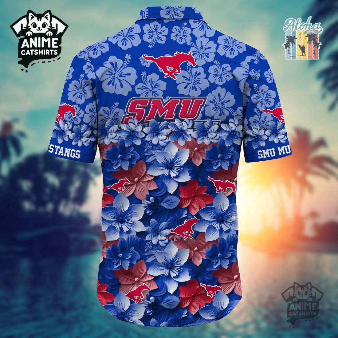The SMU Mustangs 3 Sports Hawaiian Shirt presents a vibrant and unique garment for devoted fans looking to infuse their team spirit into a laid-back, stylish wardrobe. This isn’t merely another piece of fan apparel; it’s a carefully designed statement blending the iconic imagery of Southern Methodist University with the relaxed aesthetic of a classic Hawaiian shirt. At its core, the shirt features a dynamic, all-over print that masterfully integrates the beloved SMU Mustangs logo and official team colors – scarlet and blue – within a playful tropical motif. Imagine vibrant hibiscus flowers and lush palm fronds, but instead of traditional patterns, these elements are subtly interwoven with unmistakable symbols of three distinct sports that resonate deeply with the Mustang athletic legacy: football helmets, basketballs soaring through hoops, and baseball bats crossed with classic diamonds. This “3 Sports” integration is executed with an artistic flair, ensuring the design is lively and engaging without being overwhelming, offering a fresh take on displaying allegiance that stands out from conventional jerseys or t-shirts. The color palette remains true to SMU’s identity, providing a striking visual balance between spirited fandom and tropical vacation vibes.