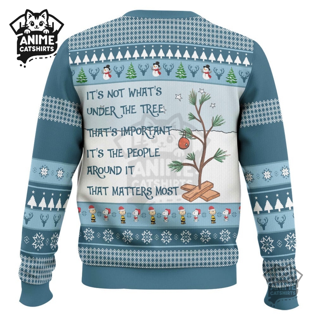 This distinctive holiday sweater provides a heartwarming and undeniably festive way to express your seasonal spirit, perfectly blending nostalgic charm with the playful irreverence of an “ugly” Christmas garment. At its core, the Snoopy And Charlie Brown “It’s Not What Under The Tree” sweater is a celebration of the beloved Peanuts characters, rendered in a deliberately kitschy yet utterly endearing design that instantly conjures memories of classic holiday specials. The central motif brilliantly captures the essence of Christmas through the eyes of Charlie Brown and Snoopy, often featuring iconic imagery such as Charlie Brown’s famously sparse Christmas tree, perhaps adorned with a single, hopeful ornament, while Snoopy might be seen napping atop his doghouse, perhaps tangled in fairy lights, or sharing a moment of quiet reflection with his best friend. The prominent text, “It’s Not What Under The Tree,” serves as a poignant reminder of the true meaning of the season, prioritizing love, friendship, and joy over material gifts. This message is not just printed, but thoughtfully integrated into the overall design, with festive fonts and colors that complement the Peanuts artwork, often surrounded by whimsical elements like scattered snowflakes, candy canes, or a subtle border of holiday patterns, all contributing to its wonderfully busy, “ugly sweater” aesthetic.
